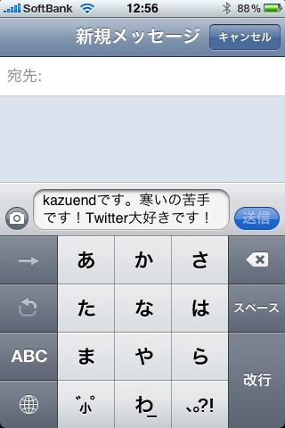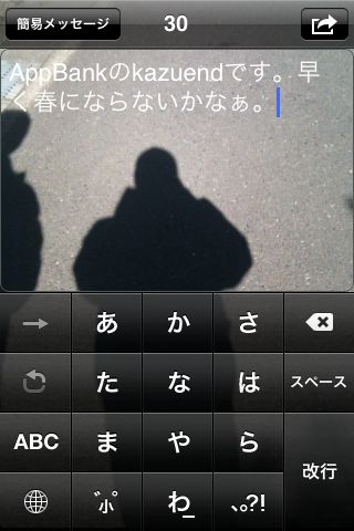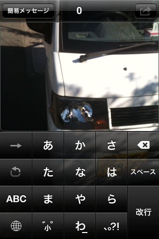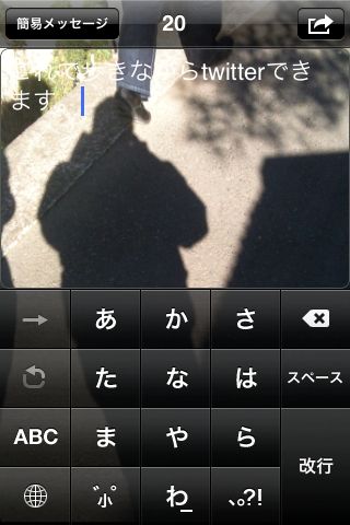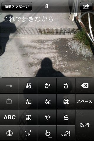 このアプリは、カメラアプリのようにレンズに写った景色を入力画面に表示しますので、視野が覆われることなく文字入力ができます。Twitter投稿だけではなく、SMS/MMS、メール送信、Facebook投稿などもできます。