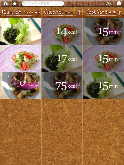 サラダがランダム、カロリー、調理時間の3種類の系統で表示されています。