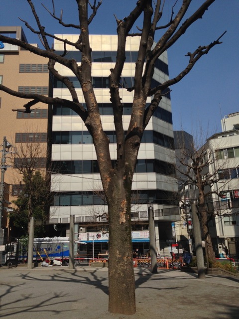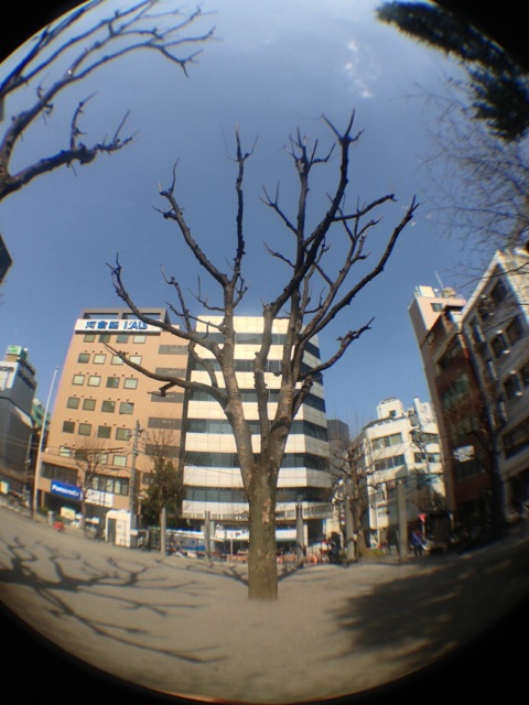 魚眼レンズを使って最初に撮影した公園の木を同じ場所から撮影すると、周囲の木々やビルまで1枚の写真に納められるようになります。
