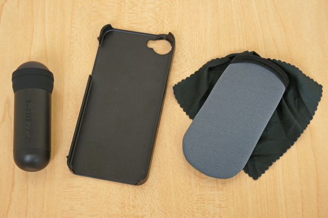 内容物はレンズの上に付けるパーツの他に、マウントを兼ねたiPhone 5ケース、ソフト素材のケースとクリーナーなどです。