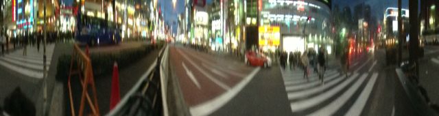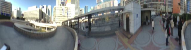 新宿のビル街を360°パノラマで撮影した写真は以下の通り。機器の特性上少しゆがみが生じていますが、通常のカメラアプリだけでは撮影できないユニークな写真が撮れました。