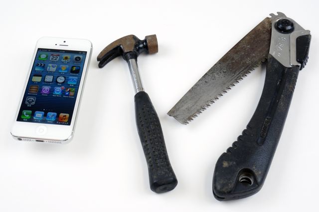 今回はHARD SHIELD GLASSの強度を確かめるために、トンカチとのこぎりを用意。