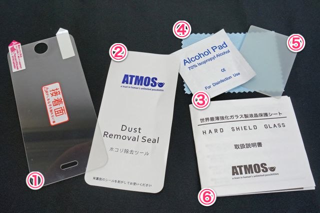 内容物はガラス本体(①)の他にホコリ除去シール(②)やアルコールを染み込ませた拭き取りシート(③)、クリーニングクロス(④)、貼り付け用のヘラ(⑤)、取り扱い説明書(⑥)などです。