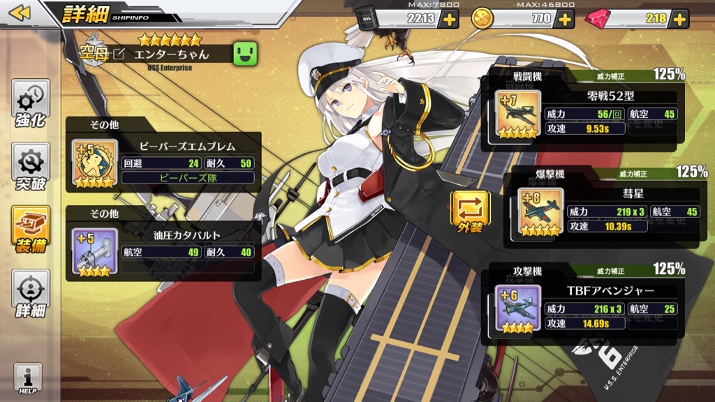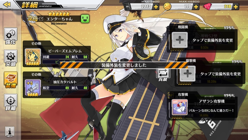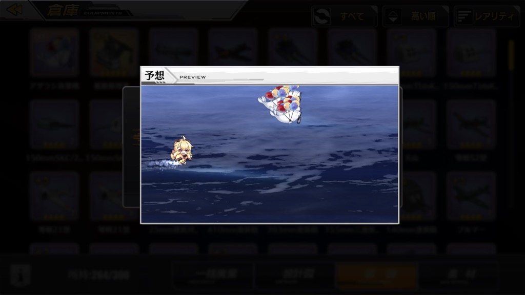 「装備外装箱」は戦闘中に飛ぶ弾や戦闘機の見た目を変えるものです。攻撃力などのステータスには全く影響がありません。強さだけを求めている場合は必要ないのですが、とにかく可愛くて笑ってしまうので、資金(コイン)に余裕のある指揮官は、ぜひ試してみてください。