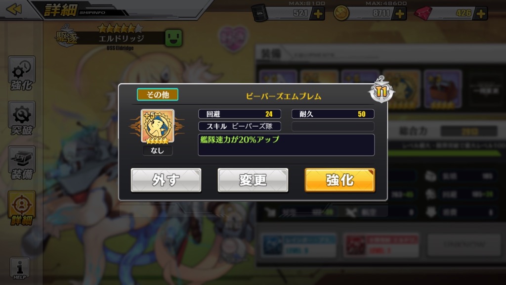 駆逐艦とは思えないほど移動速度がとても遅いというエルドチッジの欠点を補うには「ビーバーズエンブレム」がオススメです。ビーバーズエンブレムは艦隊の誰かが装備していればいいので、エルドリッジに直接つけなくてもOK。