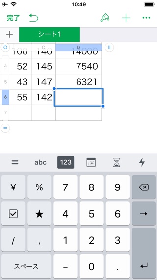 まずは計算に使う値を入力。それから計算結果を表示したいセルを選び、キーボード上の【=】をタップします。