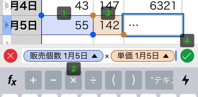 「販売個数」と「単価」から売上を出したいときは、以下のように操作して計算式を入力します。