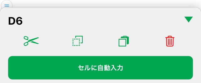 アクションメニューを開くと、そのオブジェクトで利用できる機能にアクセスできます。セルの場合、コピー・ペースト・カットのほかに自動入力が使えます。