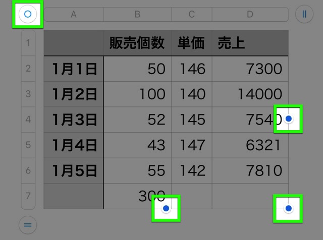 表全体のサイズを調整するときは、表の左上にある【◯】をタップ。