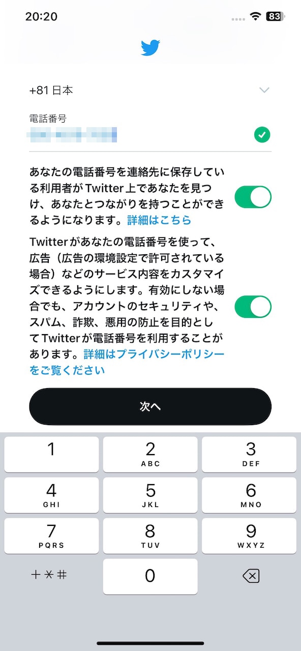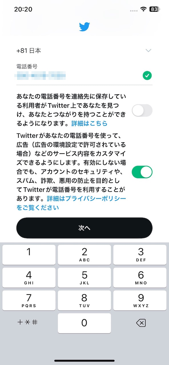 新しいアカウントに電話番号を登録する場合は「あなたの電話番号を連絡先に〜」の項目を必ずオフにしましょう。
