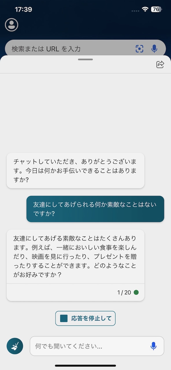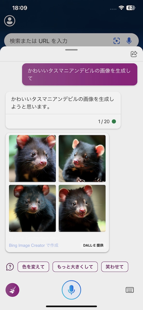 スマホ版では音声入力も可能です。音声入力をすると、Bingが回答を読み上げてくれます。