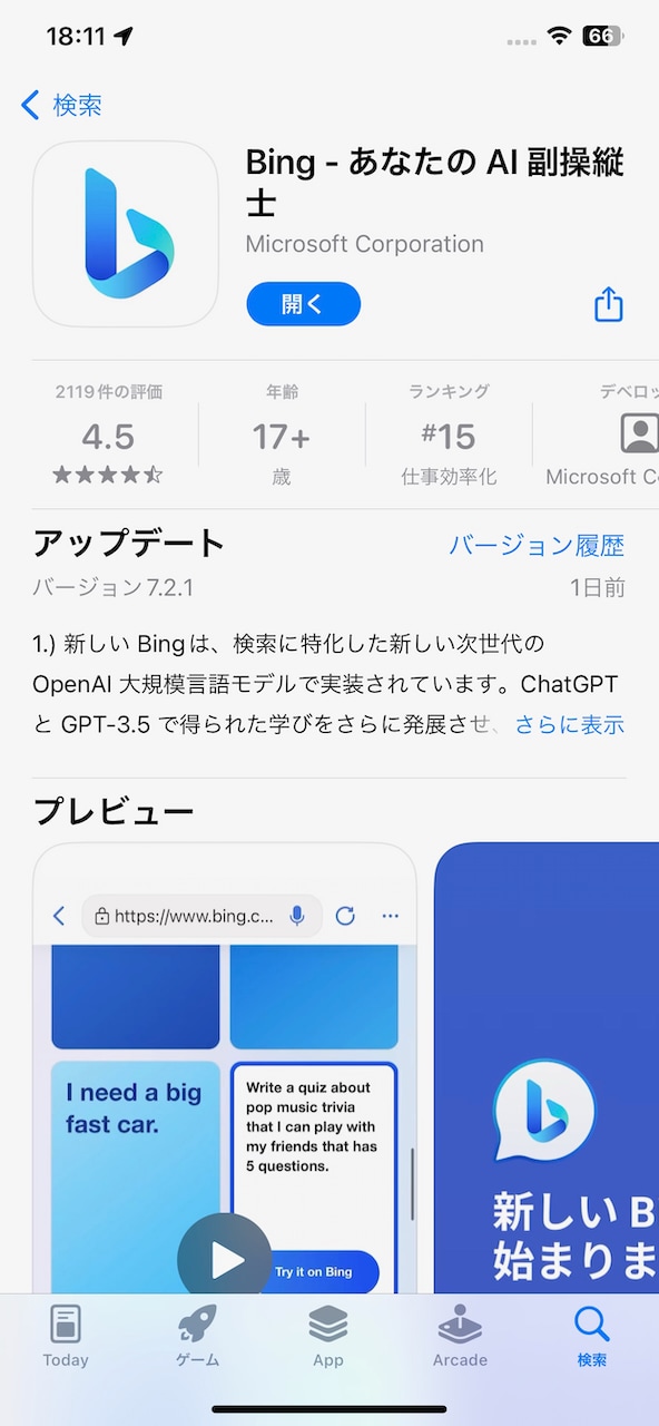 まずは以下のURLから、「Bing」アプリをインストールします。
