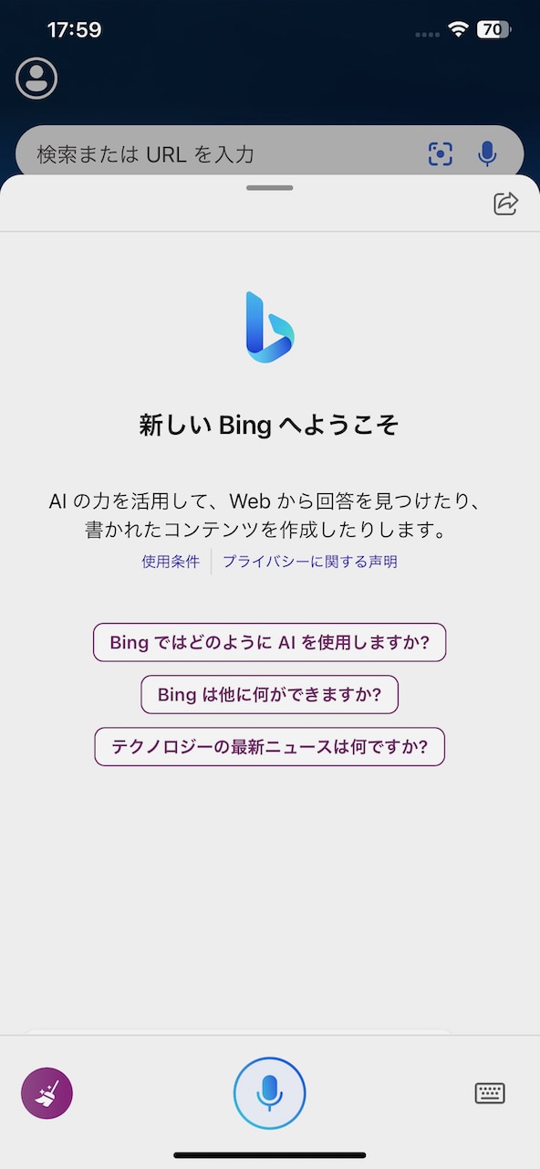 AIが使える状態になると、中央下部のロゴをタップすることでBingチャットとの会話画面が開けます。