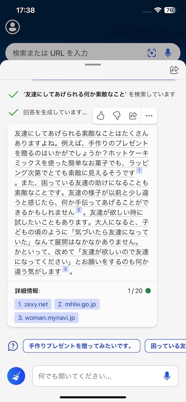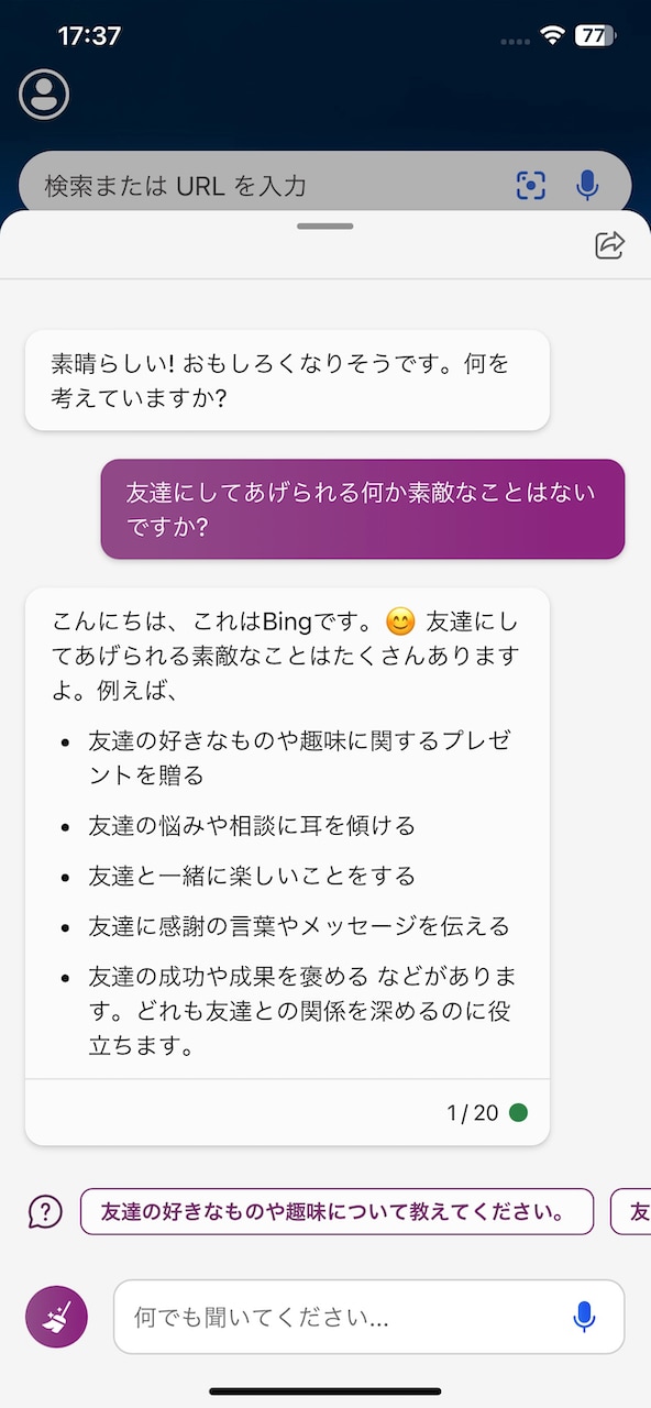 例えば、「友達にしてあげられるなにか素敵なことはないですか?」と質問するとこんな感じ。