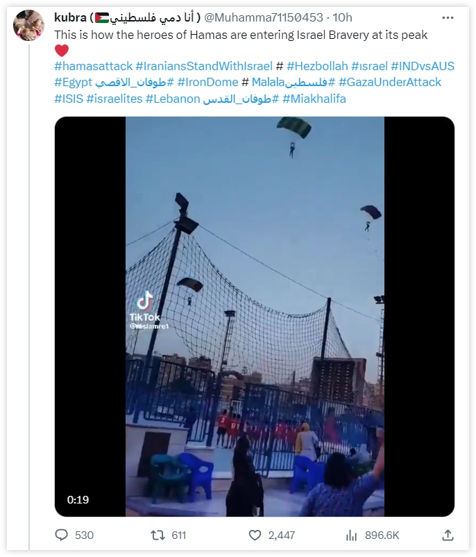 以下の2つは「ハマスの過激派がイスラエルに侵入する様子」とされたフェイク投稿です。サルダリザデ氏によれば、これはエジプトで撮影され、9月にTikTokに投稿されたものとのこと。
