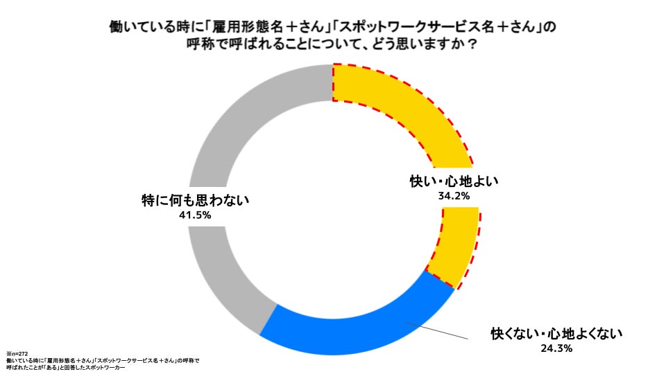 勤務中に「雇用形態名+さん」「スポットワークサービス名+さん」と呼ばれることについては、「特に何も思わない」が41.5%と最多に。また、「快い・心地よい」と回答した人は32.2%と、「快くない・心地よくない」と回答した人(24.3%)を7.9pt上回った。