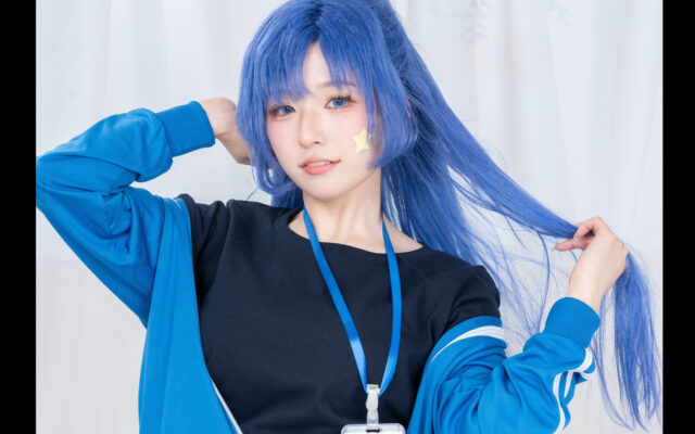 蘭藤さんが着用しているのは、鮮やかな青を基調としたボルチモアのスプレンディッド・ギアVer.衣装。エナメル素材の青いクロップドジャケットと、胸元が大きく開いた白のインナー、サイドに白黒のチェッカーフラッグ柄が入ったデザインが目を引きます。