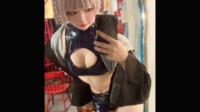 ネコ耳×黒いエナメル衣装の組み合わせが最高! 咲紅ふぁん、セクシーなネコちゃんコスプレで朝の挨拶