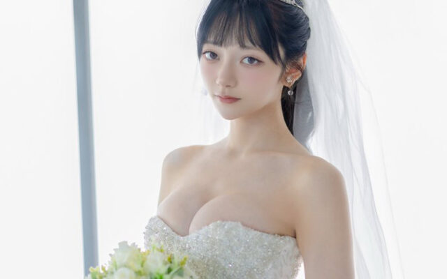優華さんが着用しているのは、真っ白なフリルたっぷりの衣装。胸元を強調するようなベルトが印象的で、ワンピースの裾からは白いショーツがのぞいているセクシーなスタイルです。