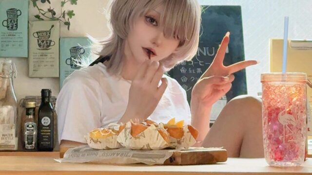 一方のコスプレ写真では、白と黒を基調としたゴシック調の衣装を着用。光沢のある黒いレザー調の素材と、脇腹の編み上げデザインがセクシーです。プラチナブロンドのストレートロングヘアに変身し、黒いヘッドドレスをつけて、まるで別人のような美しさを演出しています。
