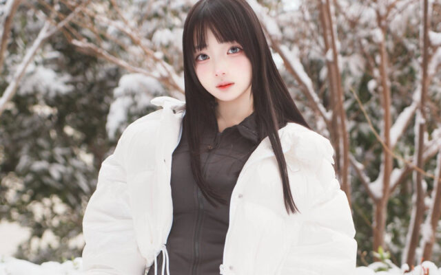 雪景色に映える肌の白さ! プー、白ダウンと黒ショートパンツで冬の撮影会を披露