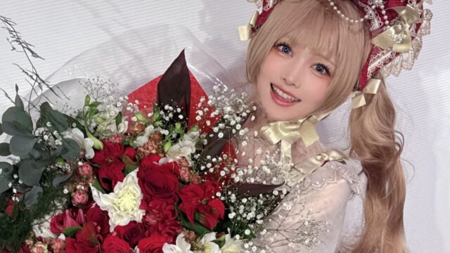 華やかな赤いドレスに祝福の花束! えい梨、バースデーパーティーの衣装を公開