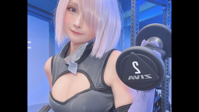 髪型も薄紫色のボブカットでマシュそのもの。ジムのような場所での撮影で、まるでゲーム内でマシュがトレーニングをしているような雰囲気を演出しています。