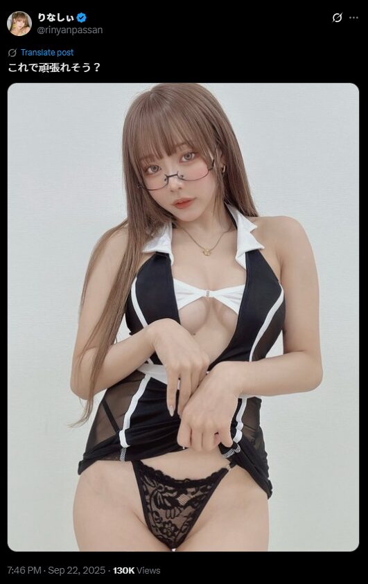 フリーランスコスプレイヤーのりなしぃさんが9月22日、「これで頑張れそう?」というコメントとともに、セクシーなメガネ姿の下着写真をXで投稿しました。