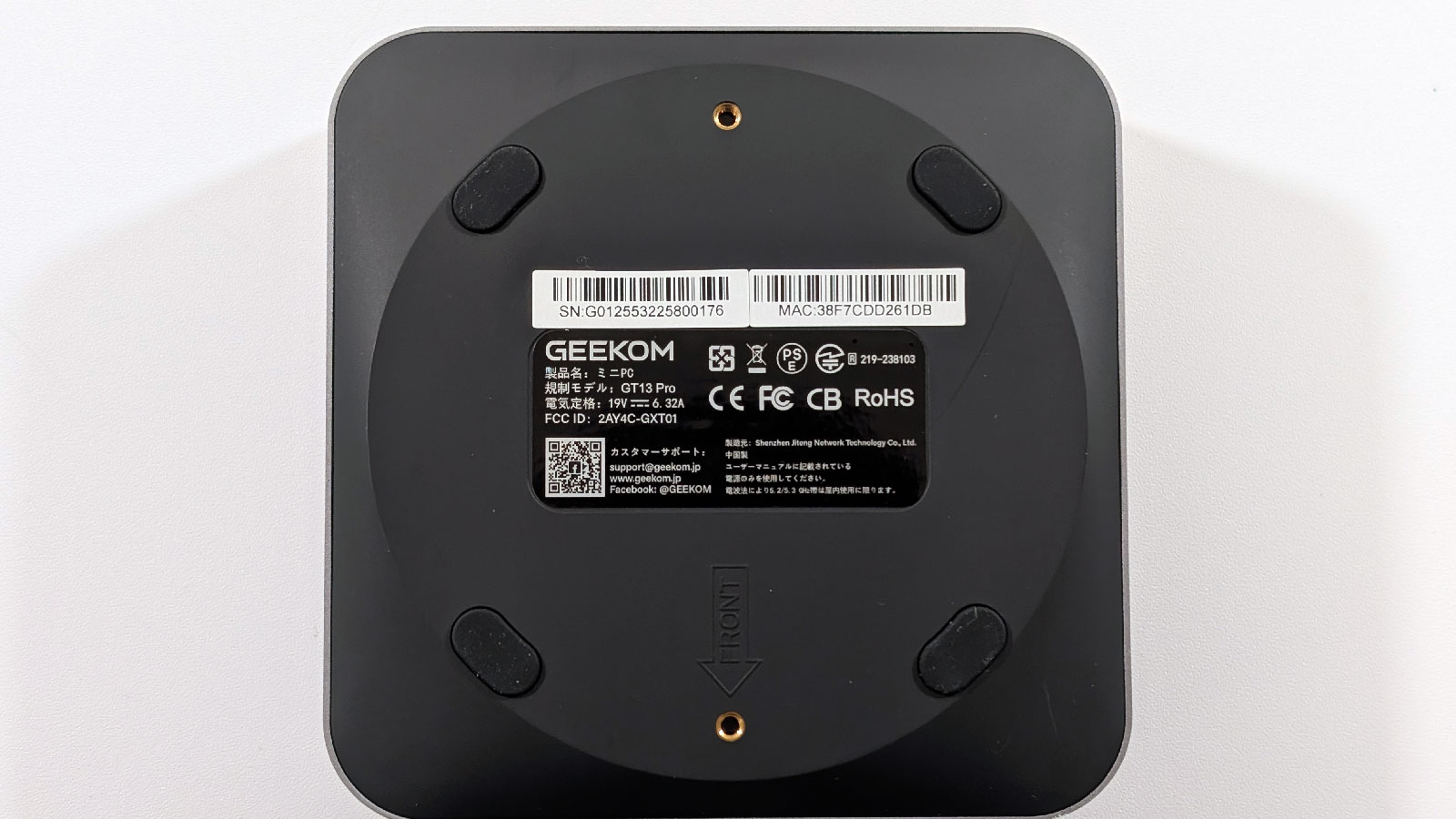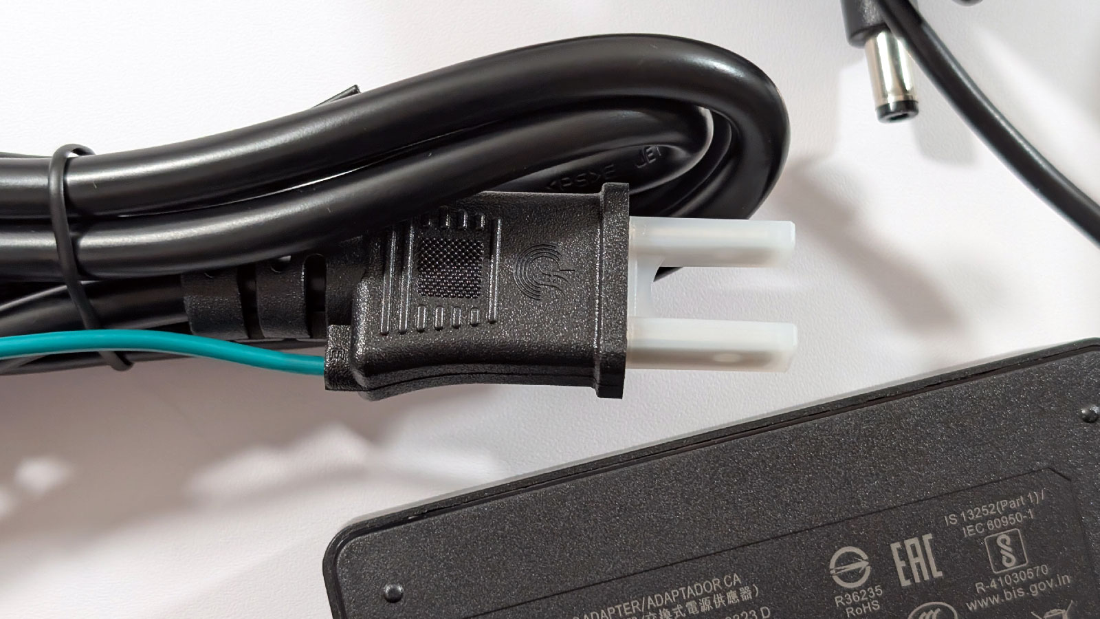 地味に嬉しいポイントとして、ACアダプターは2ピン+アースの構成です。これまでのミニPCの多くは3ピンの形状が多く、変換アダプタが必要だったのに対し、『GEEKOM GT13 Pro 2025 Edition』は普通のコンセントでそのまま使えます。