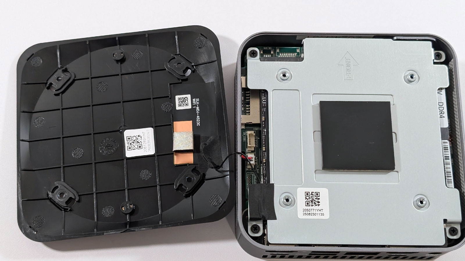 裏蓋を開けるとさらに鉄板でマザーボードが保護されており、これも四隅にあるネジを回して外すことで開けられます。