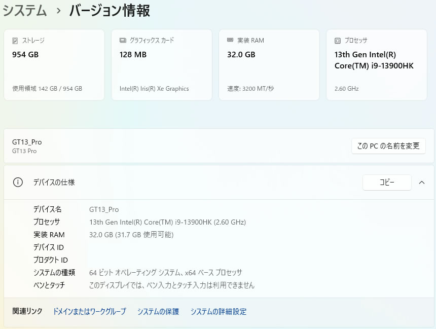 Windowsによるシステムの認識は以下の通り。スペック表通りの内容です。