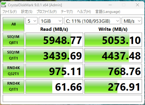 Readは5,948MB/s、Writeは5,053MB/sという結果になっています。スペック通りのGen4の速度です。