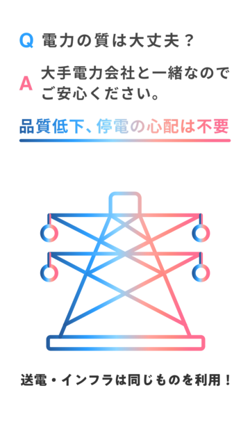 送電の仕組みやインフラも地域電力のものを使用していますので、電気の品質が落ちたり、停電が多くなることもありません。今まで通りの仕組みを使用していますので、安心して利用できます。品質は変わらず、変わるのはおトクさだけ!