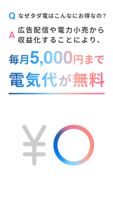 「話がうますぎて逆にアヤシイ・・・」そんな風に感じた方も安心してください! 『タダ電』はアプリ内での広告配信や、電気を5,000円以上利用した方への電気の小売を事業として展開しており、きちんとした理由のあるサービスなんです!