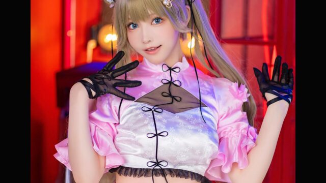 3枚目では英リサさんのコスプレを披露。ピンク×白の華やかな中華風衣装に身を包み、ツインテールのブロンドヘアがキュートな印象です。お団子ヘアの装飾も本物そっくりで、英リサさんの可愛らしさを完全再現しています。