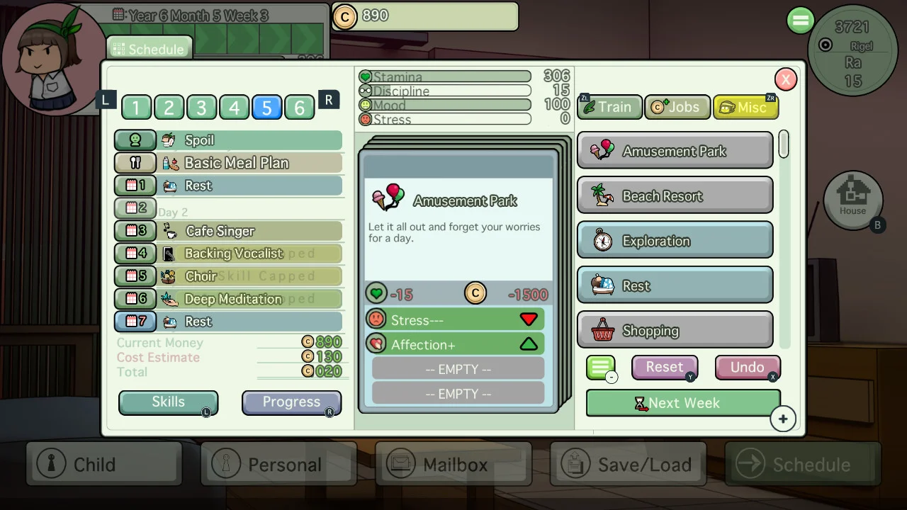 ゲームは日々のスケジュール管理を軸に展開されます。シエルの体力や気分、ストレス状態を常に監視しながら、学校での勉強、アルバイト、娯楽活動など様々なアクティビティを選択していきます。疲れすぎると活動を放棄してしまうため、アイテムでスタミナを回復させたり、時には甘やかしたり叱ったりと、親としての判断が求められます。