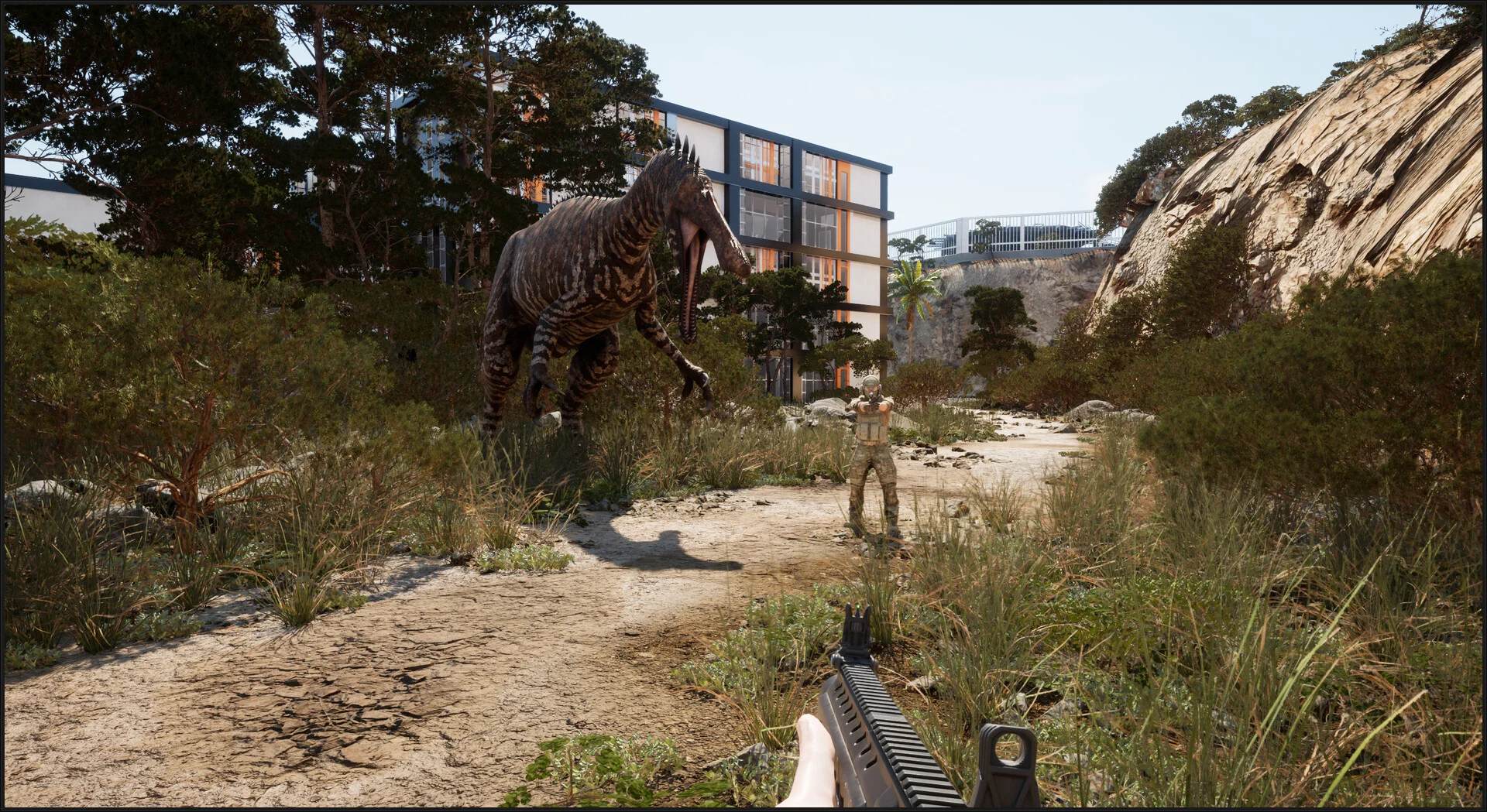 戦闘システムはFPS視点を採用しており、恐竜に発見された際は逃走するか応戦するかの判断が求められます。小型で素早い肉食恐竜の群れから、圧倒的な存在感を放つ大型恐竜まで、さまざまな敵との戦いが用意されています。豪華なリゾートホテルのテラスや荒野など、様々な環境での戦闘が展開されるため、状況に応じた戦術が重要になりそうです。