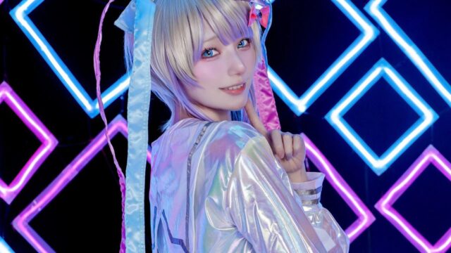 両手にはオレンジとピンクのライトスティックを持ち、楽しそうな表情を浮かべる月海つくねさん。普段は冷静沈着なビビアンですが、推しのパエトーン様のことになると熱狂的なファンに豹変するという、そのギャップが魅力のキャラクター。今回の写真は、まさにパエトーン様を応援する熱狂的なオタクモードのビビアンを完璧に再現しています。