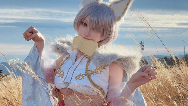 幻想的な豊穣の女神! にゃるまー。、白狐耳の和装コスプレですすき野原に降臨