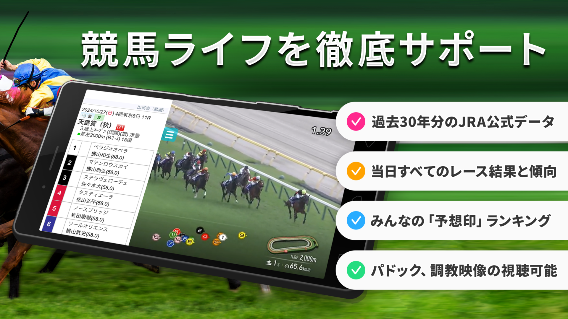 出馬表、レース結果、払戻金、馬体重、オッズ、騎手・調教師情報など、あらゆるデータをリアルタイムで配信します。