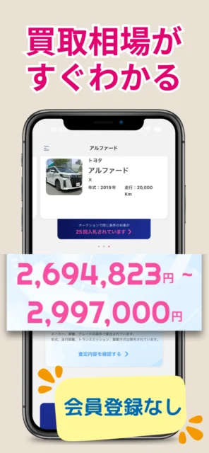 アプリを開き、車の「メーカー」「年式」「走行距離」などを入力するだけで、現在の買取相場を瞬時に表示してくれます。