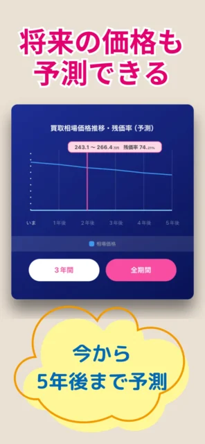 現在の買取・下取り相場価格に加えて将来の予想価格も算出してくれるので、車の乗り換えを検討中の方だけでなく、いつか乗り換える予定の方へも最適なタイミングを教えてくれるのでとってもお得で便利です。