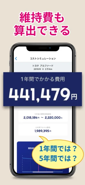 燃費、保険料、車検などをトータルで見積もり、数年後にどれくらいの価値が残るかを予測できます。