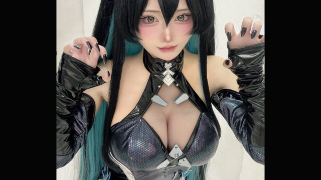 ステルスにゃんこさんが着用しているのは、リトルマーメイドの象徴的な黒いボディスーツ。光沢のあるレザー調素材に、細かい模様が全体に施されており、人魚の鱗を思わせる質感が見事に再現されています。胸元には大胆なカットアウトがあり、シルバーのメタリックパーツがアクセントとして配置されています。