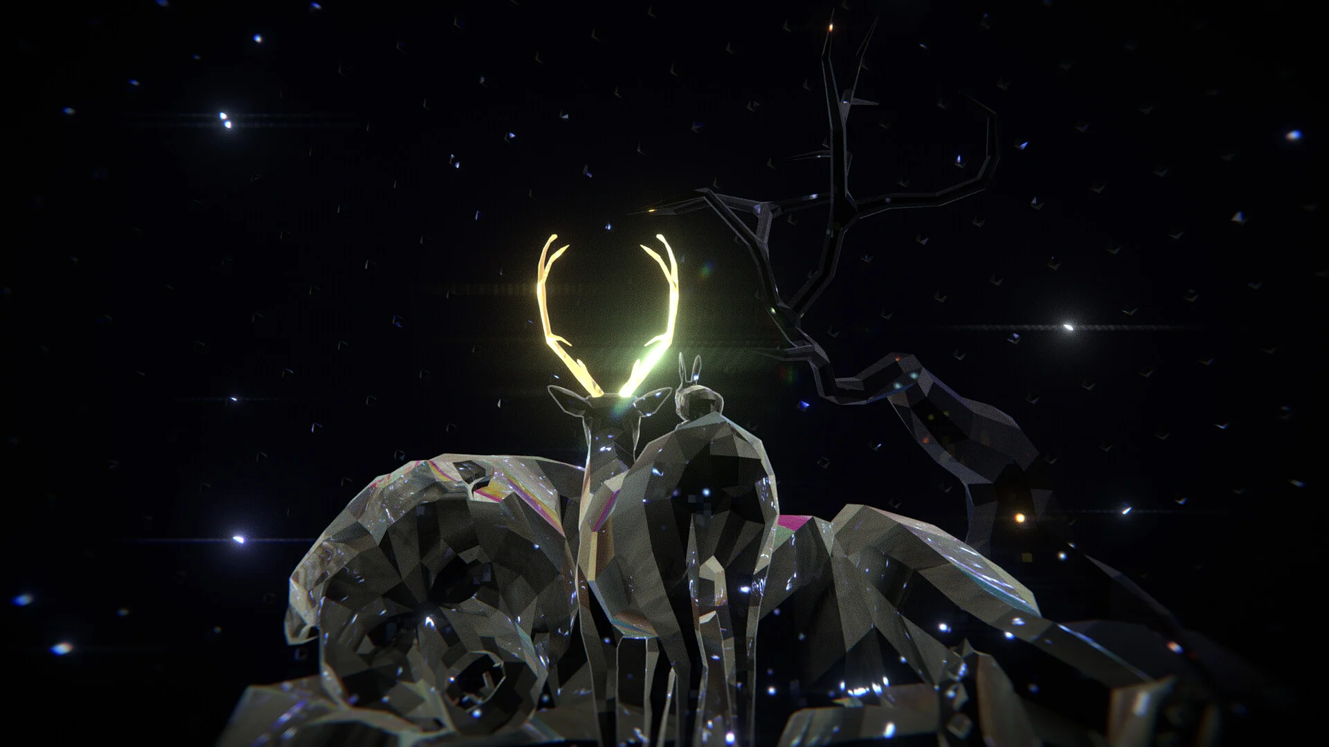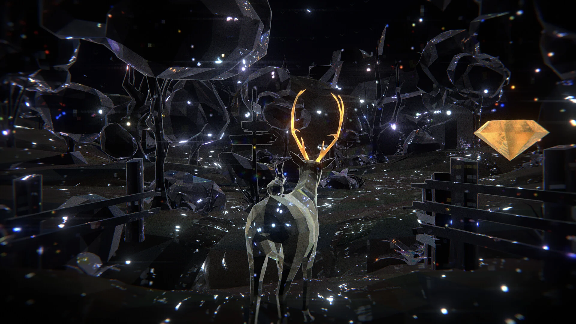 ゲームの世界は無数のクリスタルがきらめく美しい空間として表現されており、暗闇の中で光る宝石のような地形や構造物が印象的です。プレイヤーキャラクターである鹿の角は神秘的な光を放ち、時には黄金色に、時には鮮やかな緑色に輝きながら、プレイヤーを未知の場所へと導いていきます。