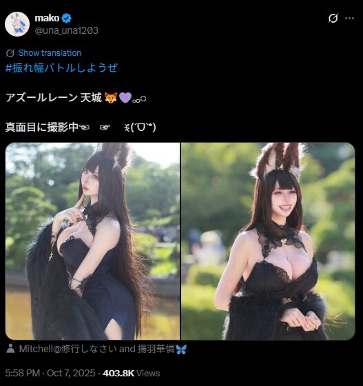 コスプレイヤーのmakoさんが10月7日、スマートフォンゲーム『アズールレーン』のキャラクター【天城】のコスプレ写真をXで投稿しました。