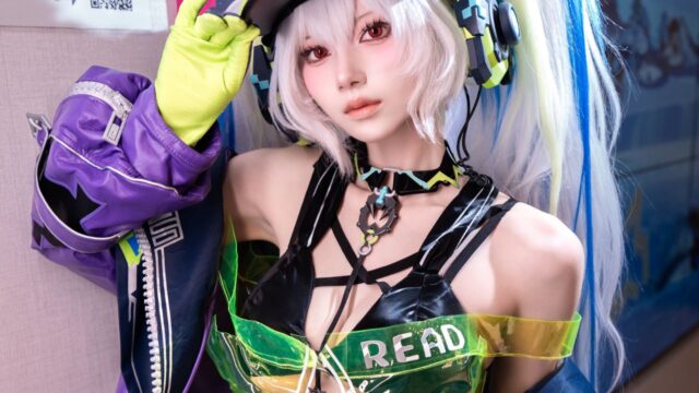 月海つくねさんが着用しているのは、『ゼンレスゾーンゼロ』のイヴリンの特徴的な白と黒を基調とした戦闘スーツ。白のノースリーブトップスに黒のタクティカルハーネスが体を縦横に走り、近未来的でスタイリッシュな印象を与えています。下半身は黒のエナメル調パンツで、光沢感が美しく反射し、イヴリンの洗練されたデザインを忠実に再現しています。
