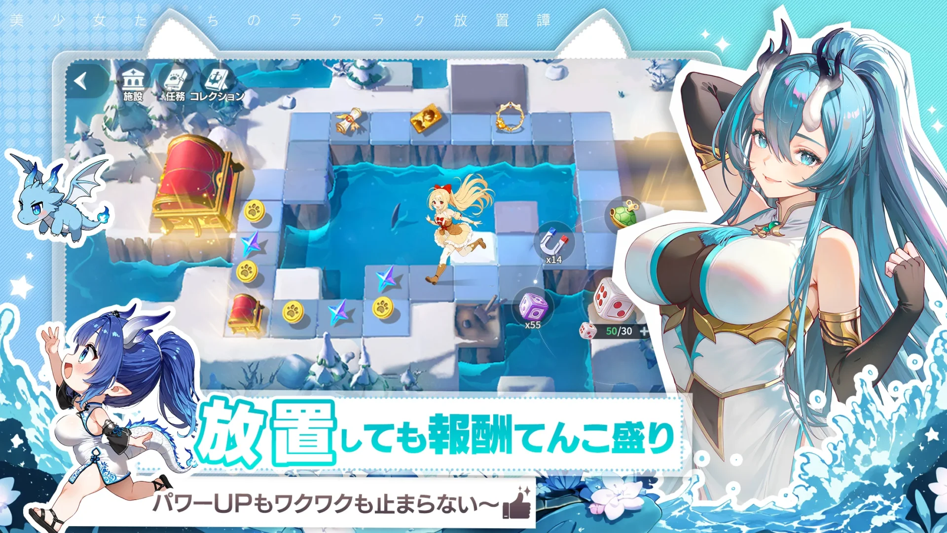 気軽に遊べる放置システムと、戦略性を備えたバトル、そして個性豊かなキャラクターたちの物語が融合した、華やかなファンタジー作品となっています。