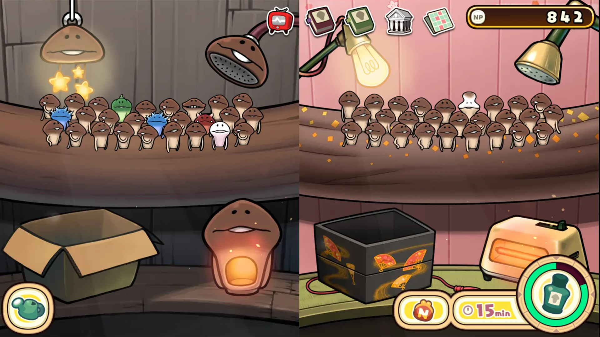 プレイヤーは、原木になめこフードを与えたらあとはのんびり待つだけ。一定時間が経つと原木の上になめこがにょきにょきと生え、タップで収穫!これだけの操作でどんどん育成が進む手軽さが魅力です。