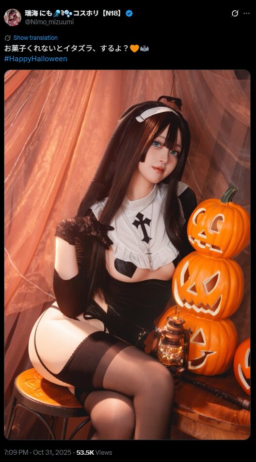 熱波師・コスプレイヤーの瑞海にもさんが10月31日、ハロウィン仕様のセクシーなシスターコスプレ写真をXで投稿しました。